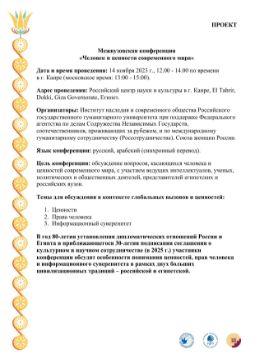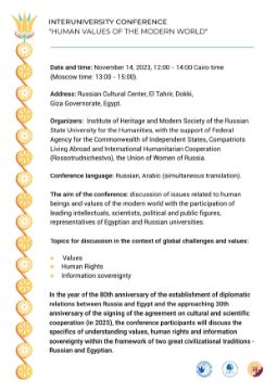 В год 80-летия установления дипломатических отношений России и Египта и приближающегося 30-летия подписания соглашения о культурном и научном сотрудничестве (в 2025 г.) участники конференции обсудят особенности понимания ценностей, прав человека и информационного суверенитета в рамках двух больших цивилизационных традиций – российской и египетской.